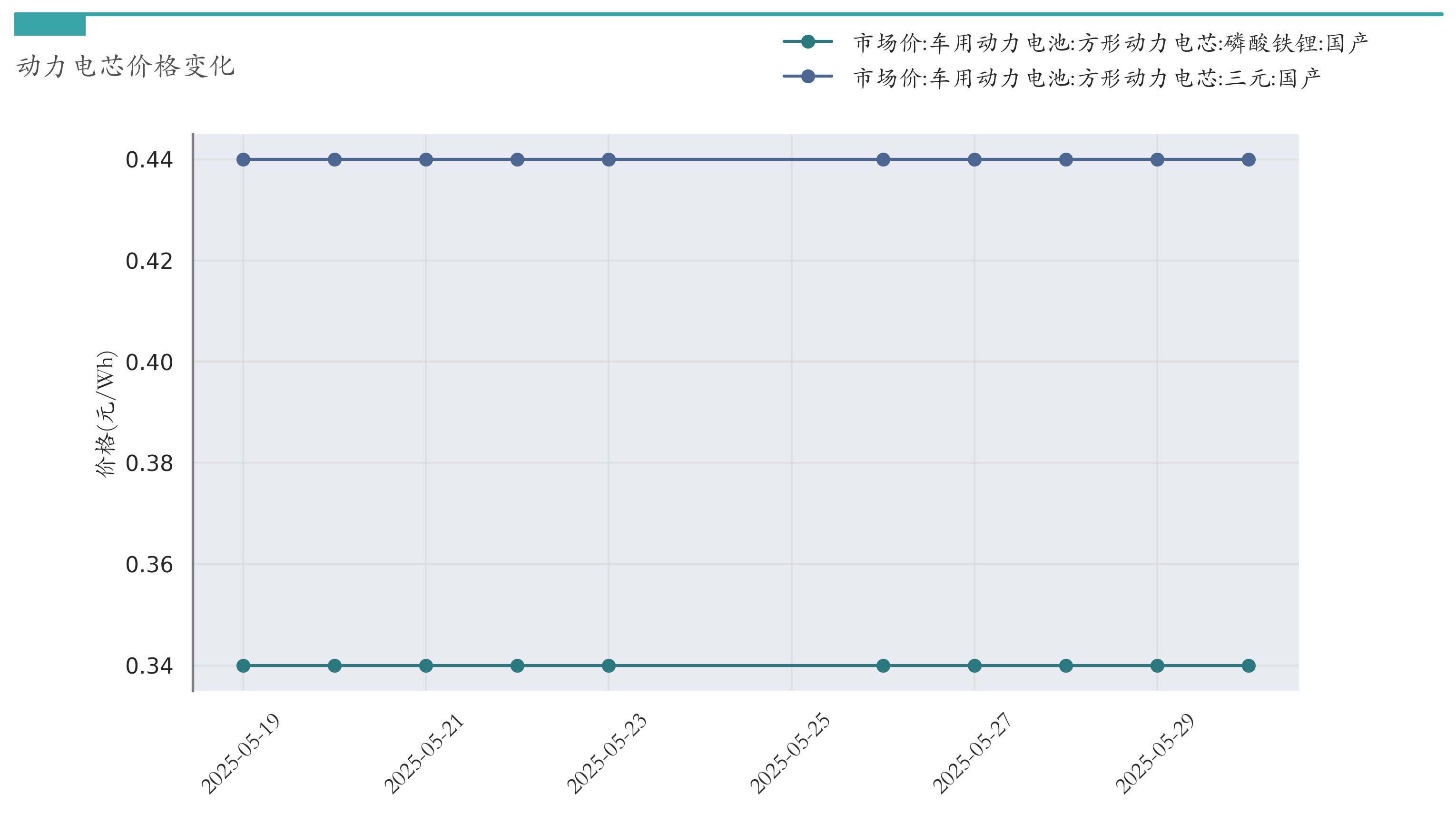 截至5月30日,方形动力电芯(磷酸铁锂)市场报价为0.34元/Wh,较5月23日持平。方形动力电芯(三元)市场报价为0.44元/Wh,较5月23日持平。近两周动力电芯价格变化如下图所示: