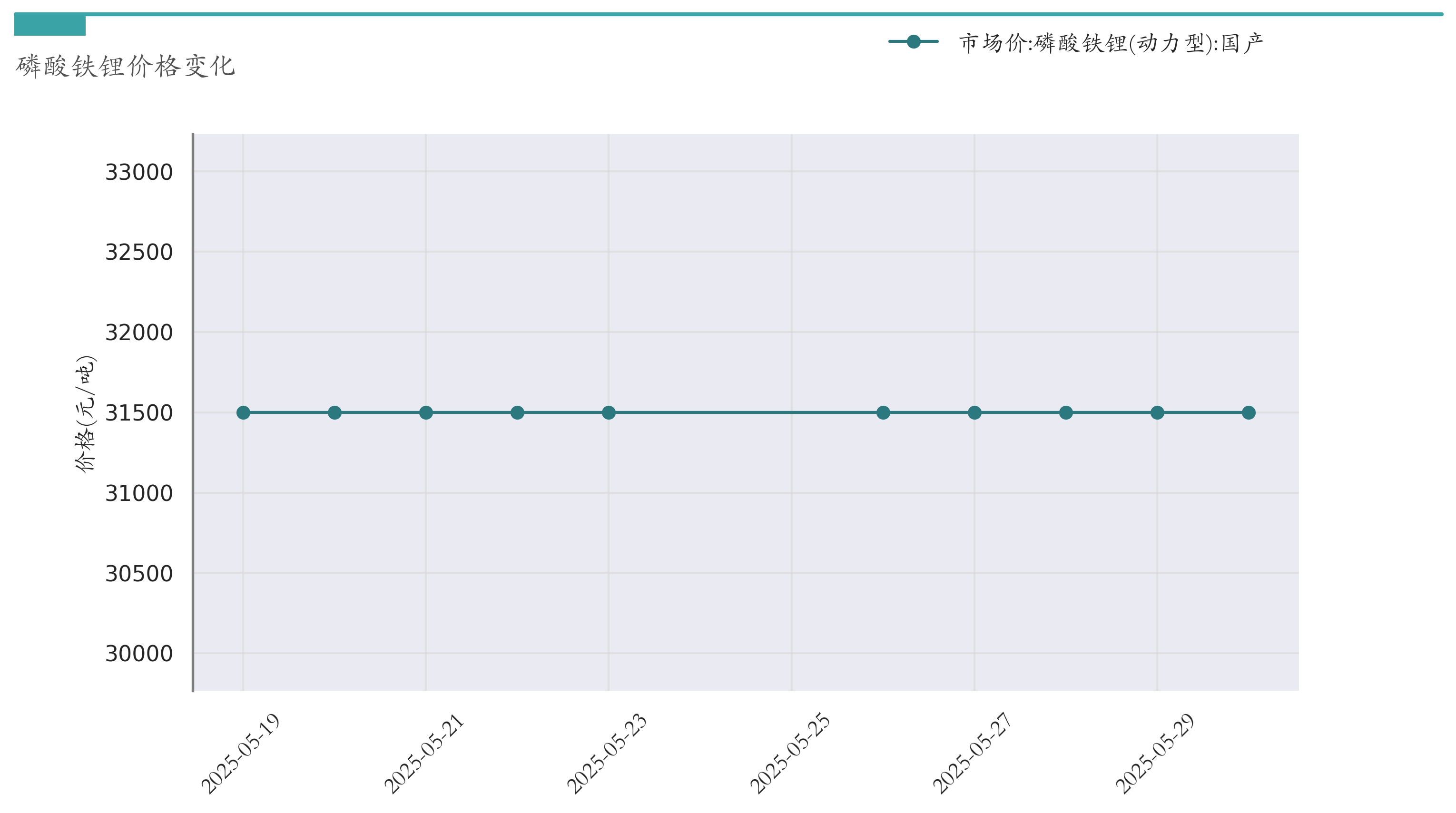 截至5月30日,磷酸铁锂市场报价为31500元/吨,较5月23日持平。近两周磷酸铁锂价格变化如下图所示: