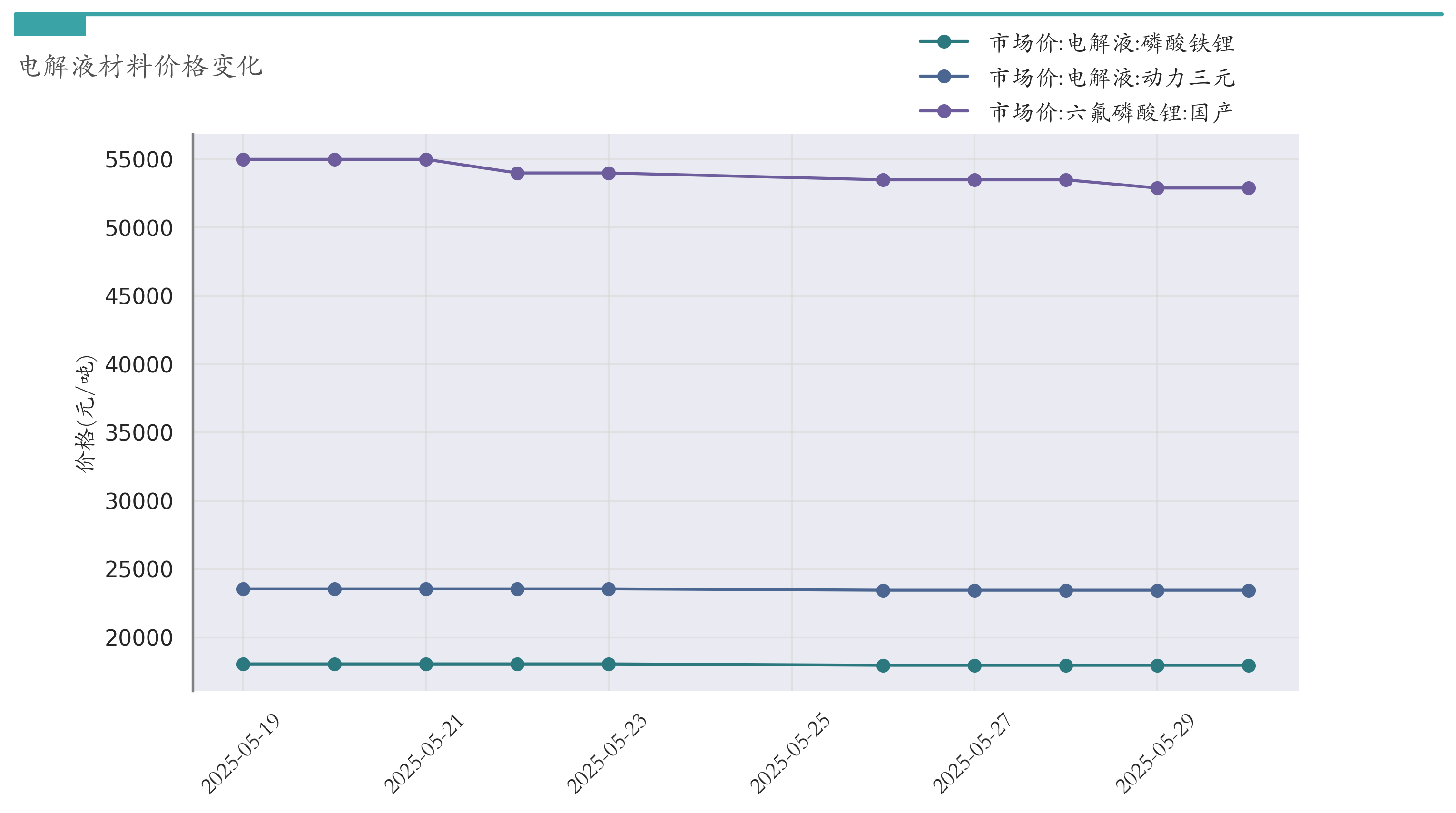 截至5月30日,六氟磷酸锂市场报价为52900元/吨,较5月23日下跌1100元/吨。电解液(磷酸铁锂)市场报价为17950元/吨,较5月23日下跌100元/吨。电解液(动力三元)市场报价为23450元/吨,较5月23日下跌100元/吨。近两周电解液材料价格变化如下图所示: