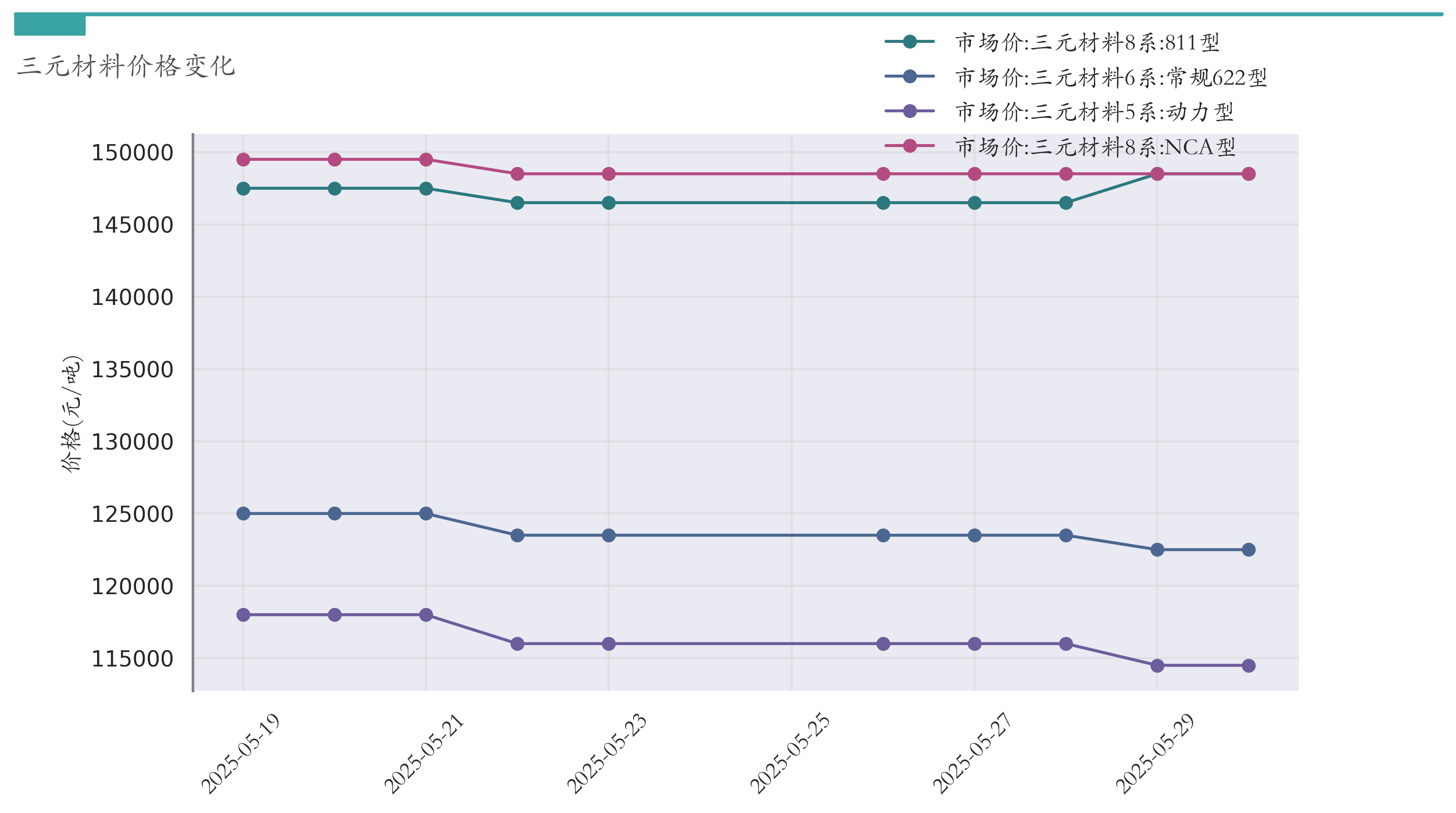 截至5月30日,三元材料8系:811型市场报价为148500元/吨,较5月23日上涨2000元/吨。三元材料8系:NCA型市场报价为148500元/吨,较5月23日持平。三元材料6系:常规622型市场报价为122500元/吨,较5月23日下跌1000元/吨。三元材料5系:动力型市场报价为114500元/吨,较5月23日下跌1500元/吨。近两周三元材料价格变化如下图所示: