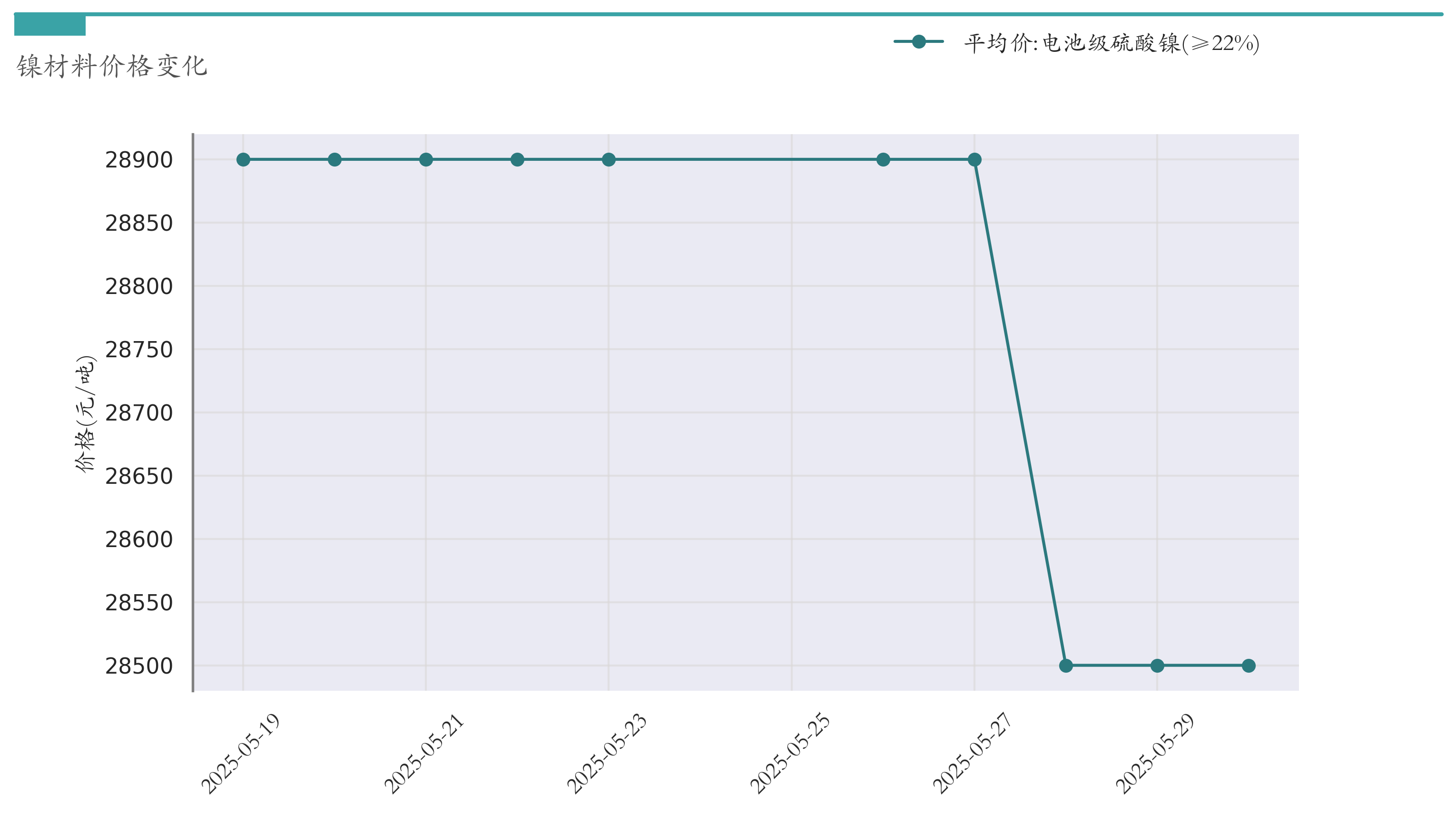 截至5月30日,电池级硫酸镍平均报价为28500元/吨,较5月23日下跌400元/吨。近两周镍材料价格变化如下图所示: