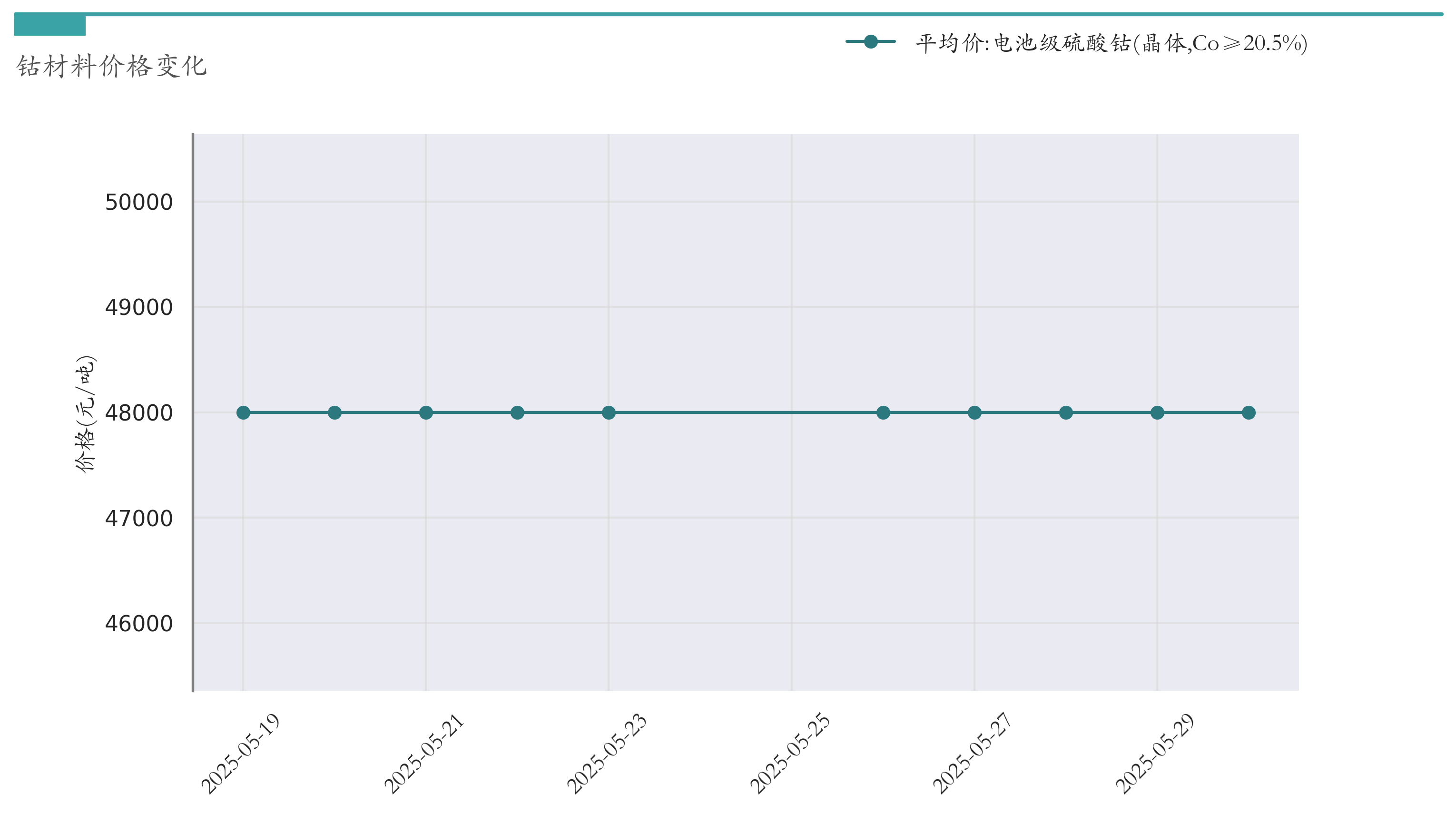 截至5月30日,电池级硫酸钴平均报价为48000元/吨,较5月23日持平。近两周钴材料价格变化如下图所示:
