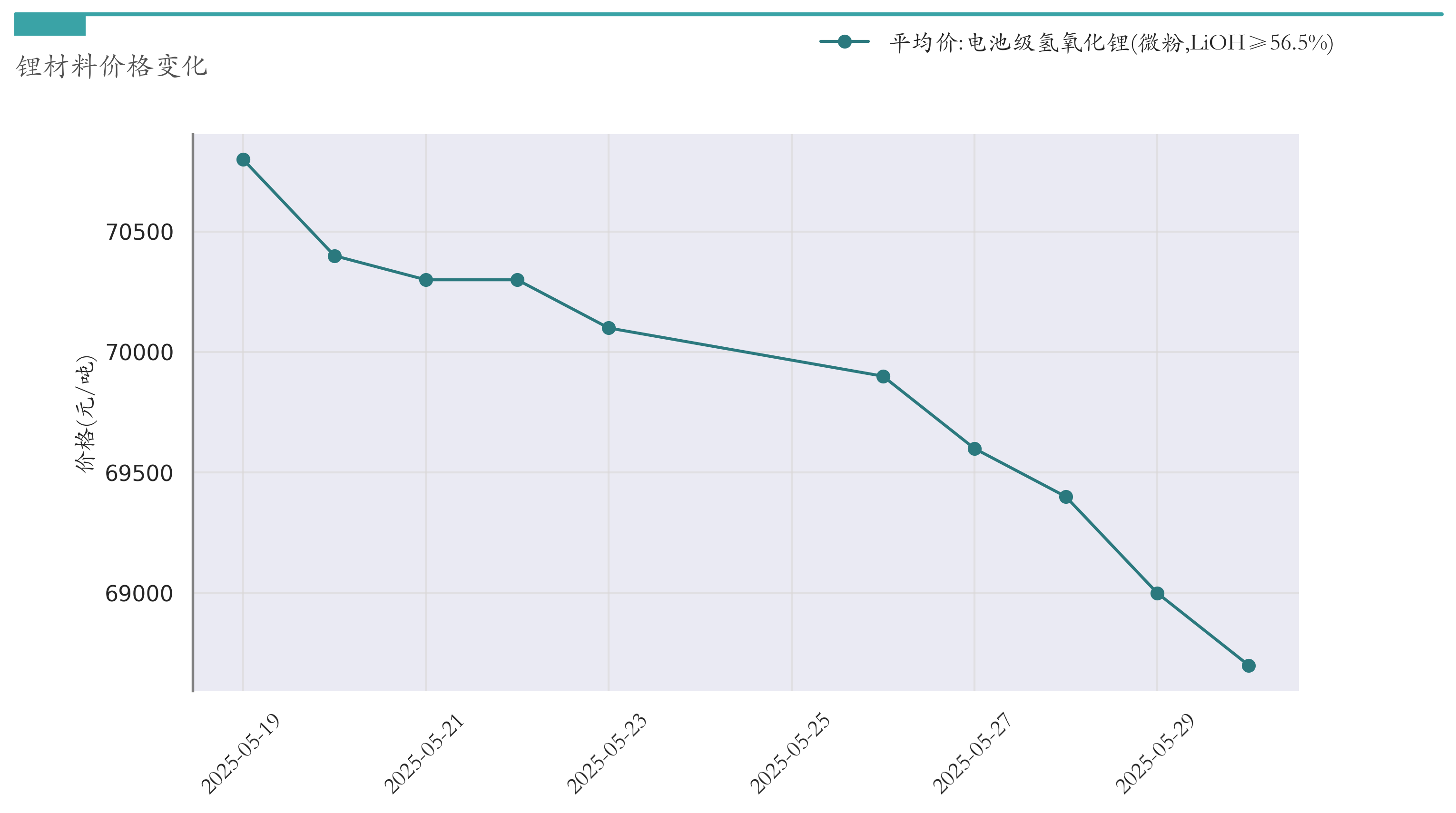 截至5月30日,电池级氢氧化锂平均报价为68700元/吨,较5月23日下跌1400元/吨。近两周氢氧化锂价格变化如下图所示:
