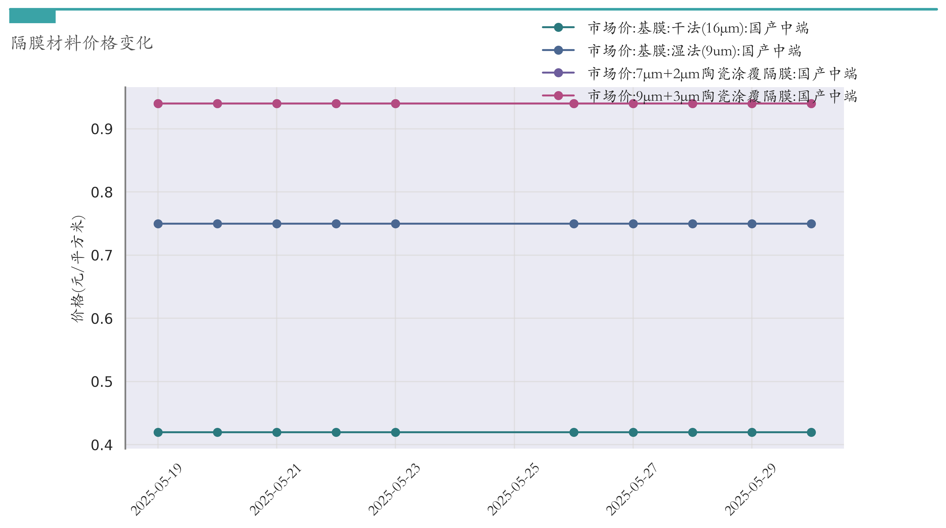 截至5月30日,干法16μm基膜市场报价为0.42元/平方米,较5月23日持平。湿法9um基膜市场报价为0.75元/平方米,较5月23日持平。7μm+2μm陶瓷涂覆隔膜市场报价为0.94元/平方米,较5月23日持平。9μm+3μm陶瓷涂覆隔膜市场报价为0.94元/平方米,较5月23日持平。近两周隔膜材料价格变化如下图所示:
