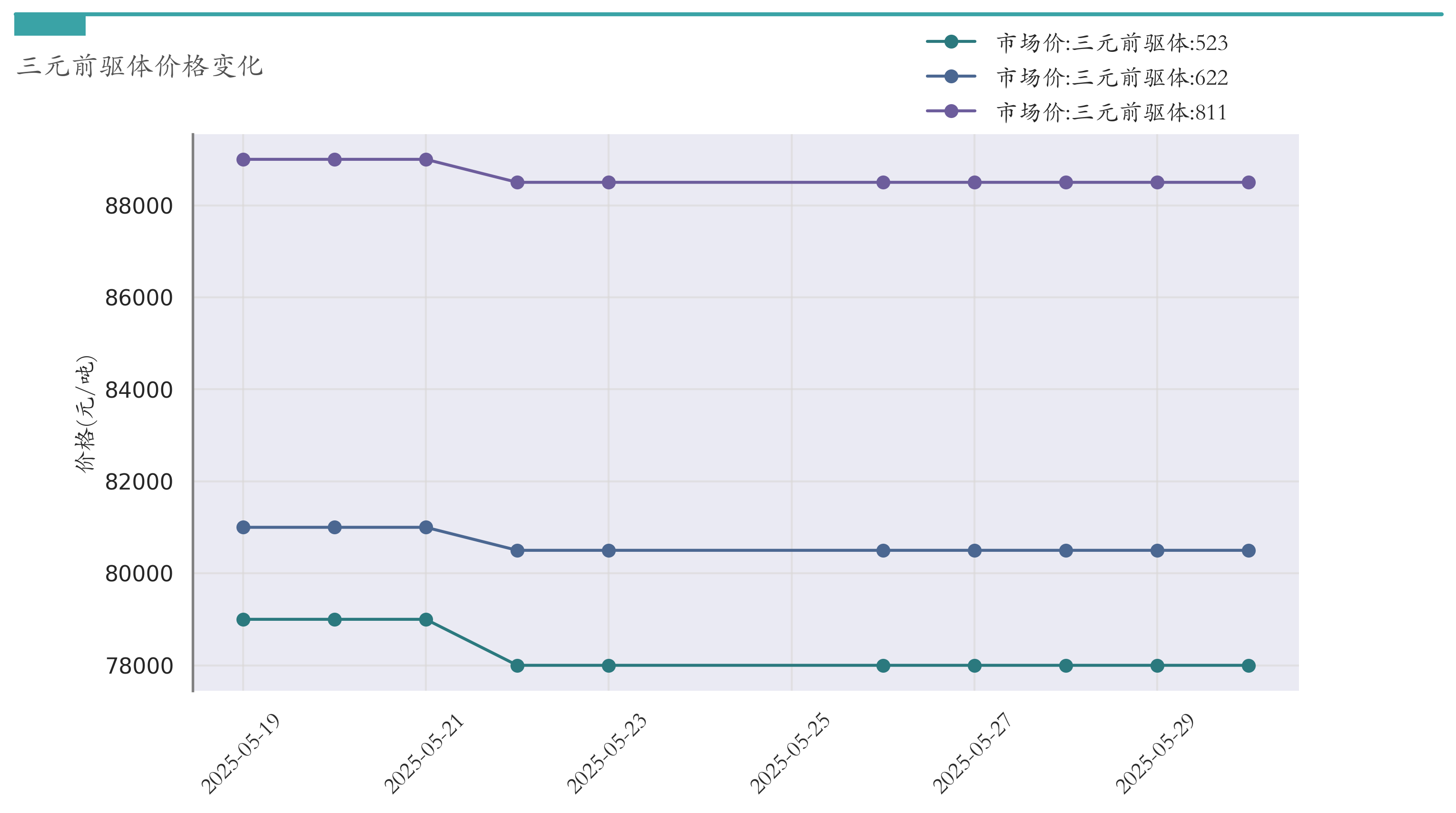 截至5月30日,三元前驱体811市场报价为88500元/吨,较5月23日持平。三元前驱体622市场报价为80500元/吨,较5月23日持平。三元前驱体523市场报价为78000元/吨,较5月23日持平。近两周三元前驱体价格变化如下图所示: