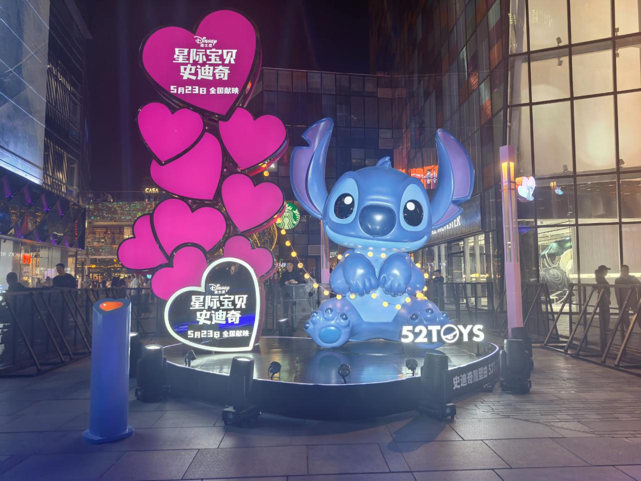 在北京三里屯商圈,一个巨大的史迪奇雕像立在街头,吸引不少行人拍照打卡。这是由潮玩品牌52TOYS打造的迪士尼知名IP史迪奇巨型装置,其配色灵感来自品牌于电影《星际宝贝史迪奇》上映前夕推出的新品“史迪奇暖粉系列”。