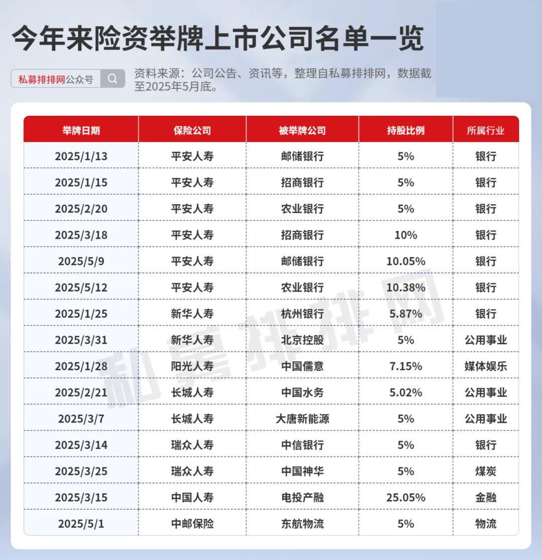 值得注意的是,险资从去年下半年开始,通过增持方式举牌(持股比例达5%以上)上市公司明显加速。2024上半年险资举牌上市公司为4次,下半年高达16次。而今年开年以来举牌次数就已达15次,这在国内保险行业历史上是非常密集的一段时期。