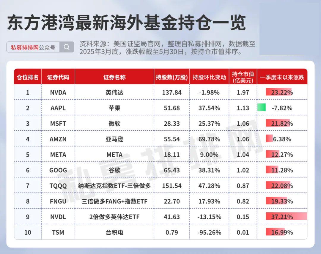 从一季度东方港湾海外基金的持仓来看,但斌延续了对人工智能和美股科技龙头的长期押注。增持了包括苹果、微软、亚马逊、谷歌等核心标的,而英伟达只是小幅减仓,仍位居第一大重仓股;此外但斌还通过3倍做多纳斯达克100ETF(TQQQ)、3倍做多FANG+指数ETF(FNGU)、以及二倍做多英伟达ETF等杠杆产品增强收益。