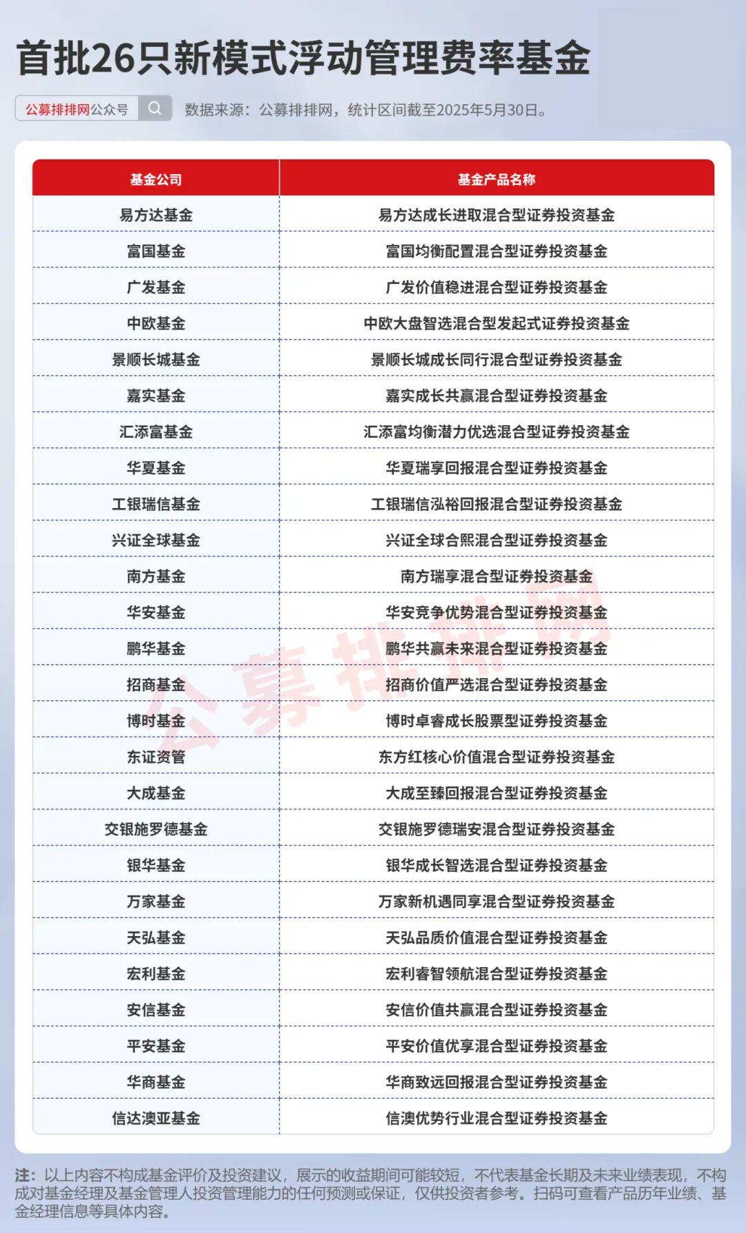 5月23日,首批26只新模式浮动管理费率基金正式获批,易方达基金、富国基金、博时基金、南方基金、中欧基金、东方红资产管理、景顺长城基金等公募机构参与其中。预计5月底迎来发行,6月底前基本完成募集。