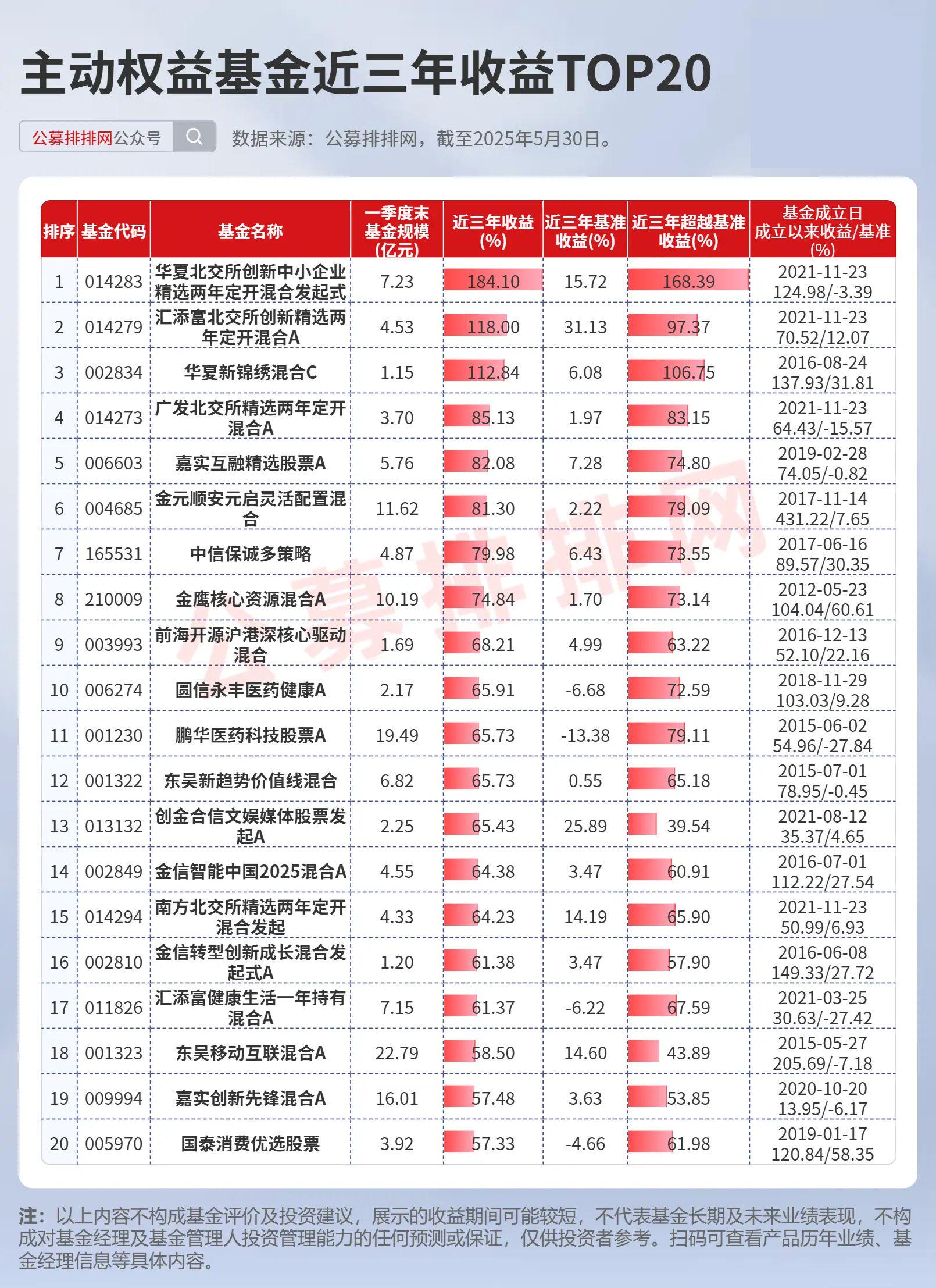 公募排排网数据统计,截至2025年5月30日,近三年有业绩和对应基准收益的基金产品共13547只,其中近三年收益超越对应基准在10%以上的基金共有1793只,占比为13.23%。