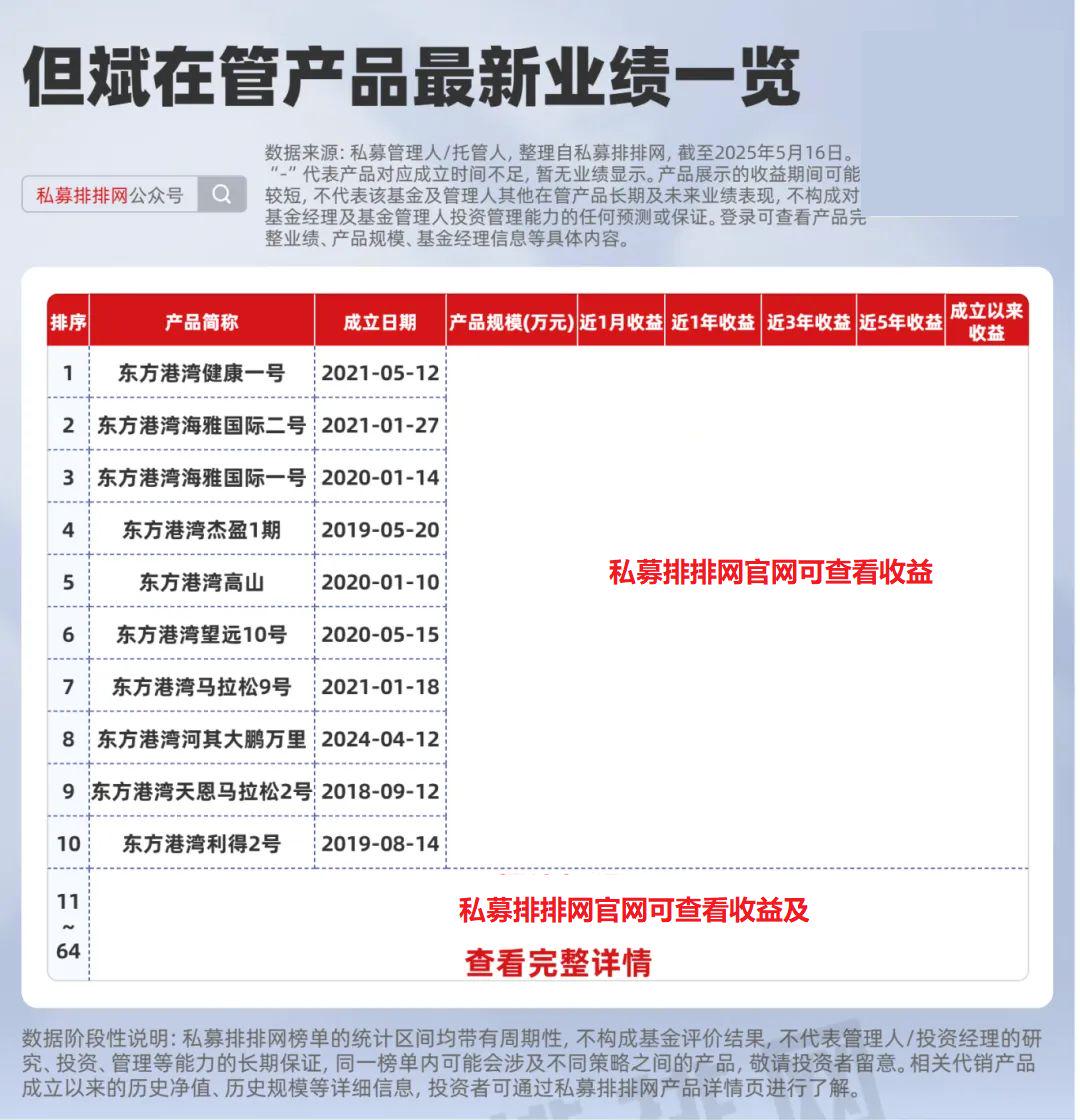 私募排排网数据显示,截至5月16日,但斌管理的64只产品合计规模约为80.60亿元,近1个月平均收益率高达***%、近1年平均收益率为***%、近3年平均收益率为***%。