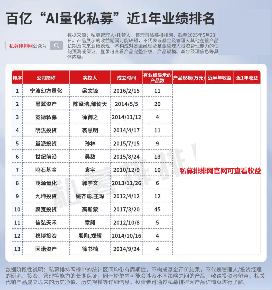 根据私募排排网数据梳理的15家百亿AI量化私募中,有业绩显示产品在3只以上的私募共13家。业绩排名来看,截至2025年5月23日,DeepSeek背后的幻方量化不管在近半年还是近1年的收益均值都位居第一,旗下11只产品合计规模约为18.57亿元,近半年收益为***%,近1年收益均值高达***%。
