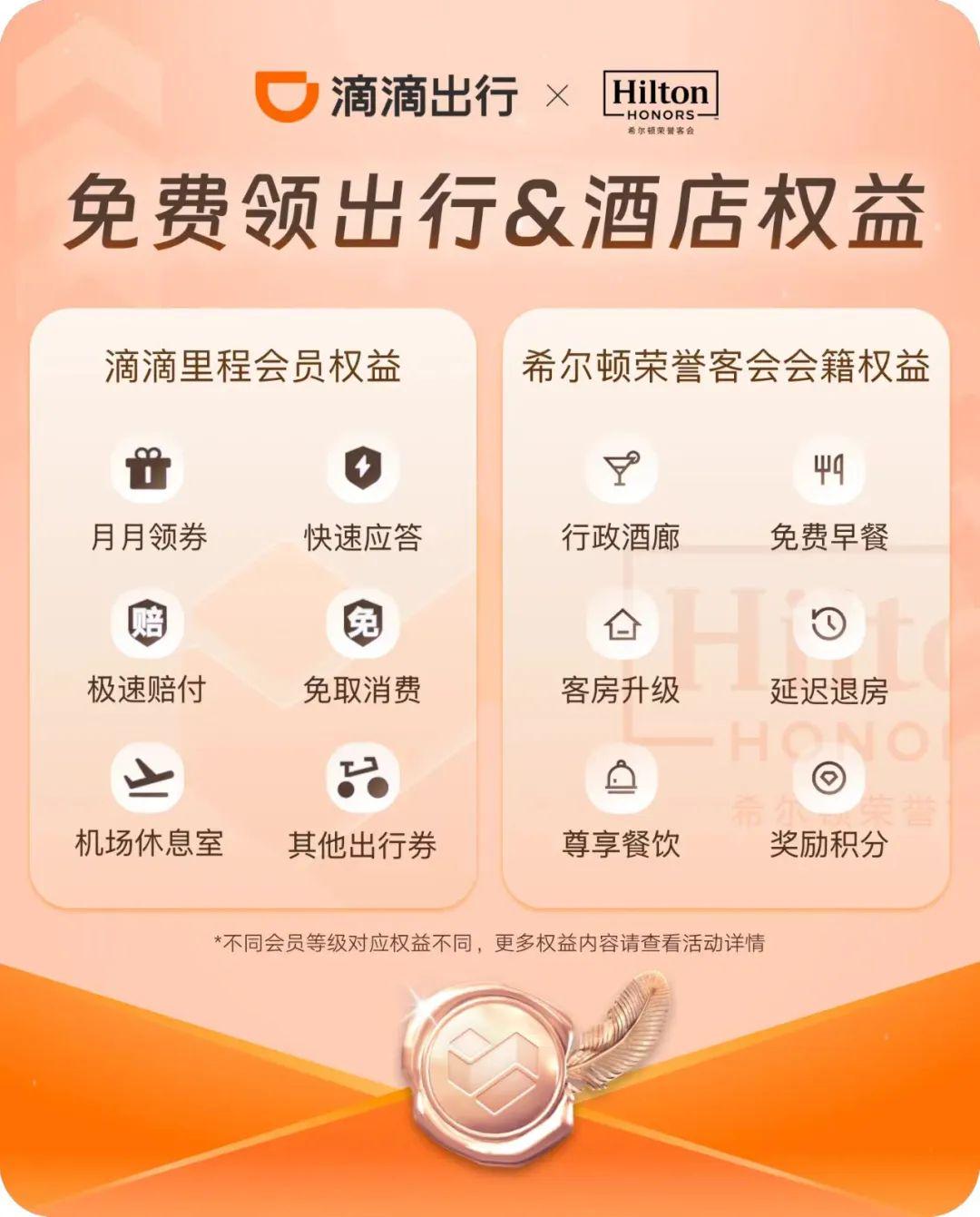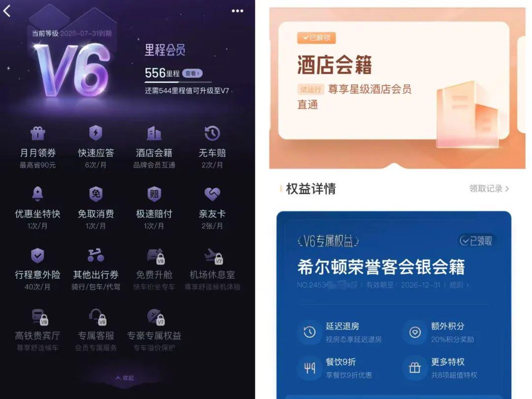 他还发现,获得五星级酒店会员卡的途径越来越多。近期滴滴与希尔顿集团宣布打通会员体系,滴滴V6-V8级会员可兑换希尔顿银会籍至钻石会籍,享受房型升级、免费早餐、行政酒廊等权益,V8匹配的钻石会籍属于希尔顿最高级别的会员礼遇。与此同时,希尔顿银会籍以上会员也可兑换滴滴V5-V7里程会员,享受快速应答、机场休息室等权益。