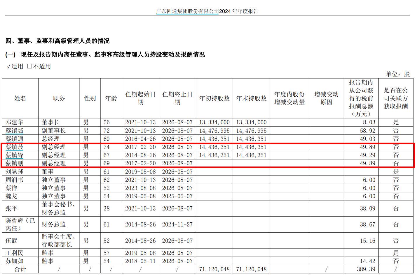 *ST四通2024年年报显示,蔡镇茂、蔡镇鹏、蔡镇锋三人年龄分别为74岁、69岁、67岁,2024年从公司获得的税前报酬总额分别为49.89万元、49.89万元、49.29万元。