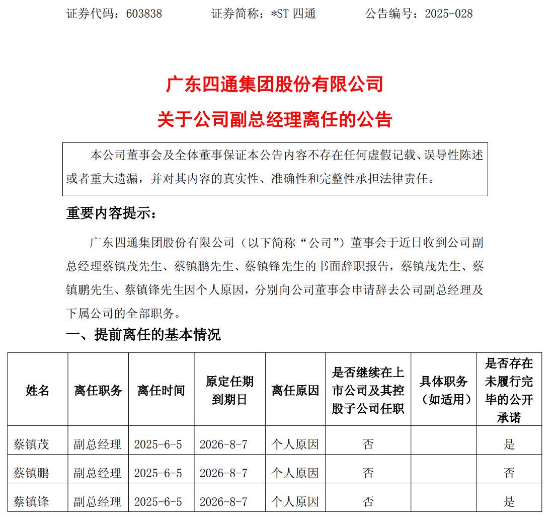 中新经纬6月5日电 *ST四通(广东四通集团股份有限公司)5日晚间公告,蔡镇茂、蔡镇鹏、蔡镇锋三兄弟辞去公司副总经理及下属公司的全部职务。