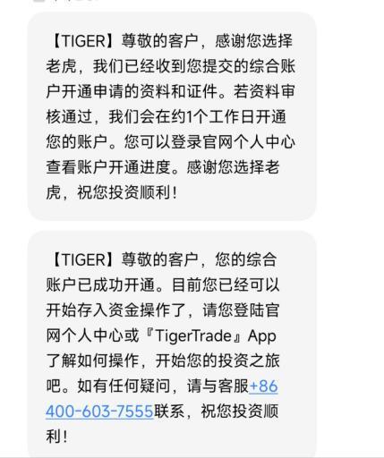 记者将此虚假证明材料提交至老虎证券开户流程审核,不超过半小时便收到了老虎证券发送的综合账户开户成功的短信通知,APP也显示开户成功。