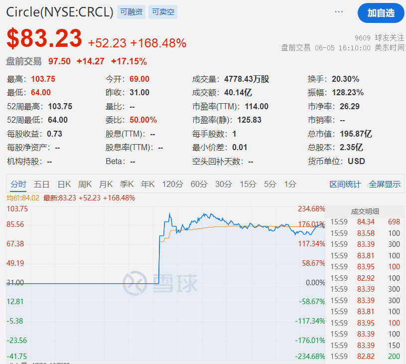 美东时间6月5日,全球稳定币领域第一股Circle(股票代码CRCL)以每股31美元发行价登陆纽交所,开盘价直接飙升至66.75美元。经历盘中熔断后继续上冲,最终收于82.88美元,单日涨幅达167.35%,市值瞬间膨胀至182.78亿美元(约1316亿人民币)。