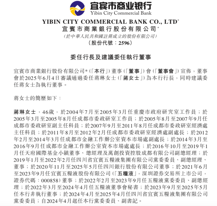4日,宜宾银行(02596.HK)发布公告,董事会于当日审议通过委任蒋琳为新任行长,同时建议委任蒋琳为执行董事。董事会同意在国家金融监督管理机构核准蒋琳的行长任职资格前,由蒋琳代为履行行长职责,代为履职期限自董事会审议通过之日起不超过6个月。