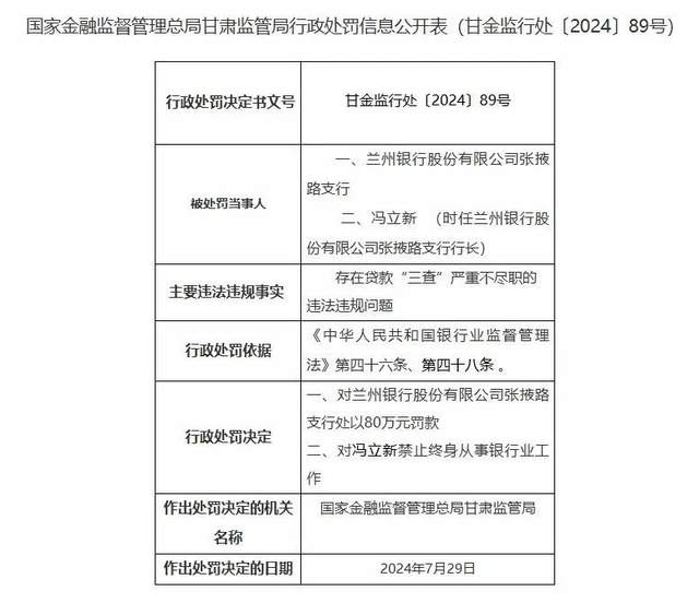 相关处罚信息显示,兰州银行张掖路支行存在贷款“三查”严重不尽职的违法违规问题,国家金融监督管理总局甘肃监管局对兰州银行张掖路支行处以80万元罚款。时任兰州银行张掖路支行行长的冯立新对该行的违法违规行为负有责任,被禁止终身从事银行业工作。