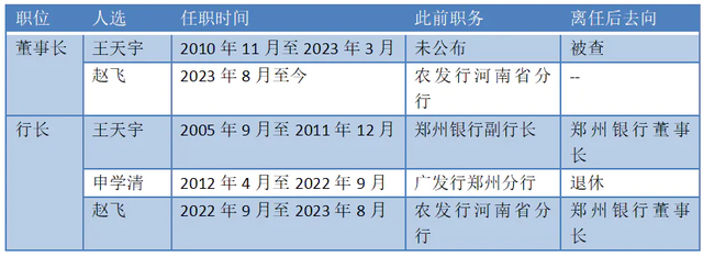 2023年3月,当了6年行长外加12年董事长的王天宇,突然辞去郑州银行董事长等职务,行长赵飞于同年7月“补位”,获批任职董事长一职,并于8月正式辞去了郑州银行行长一职。