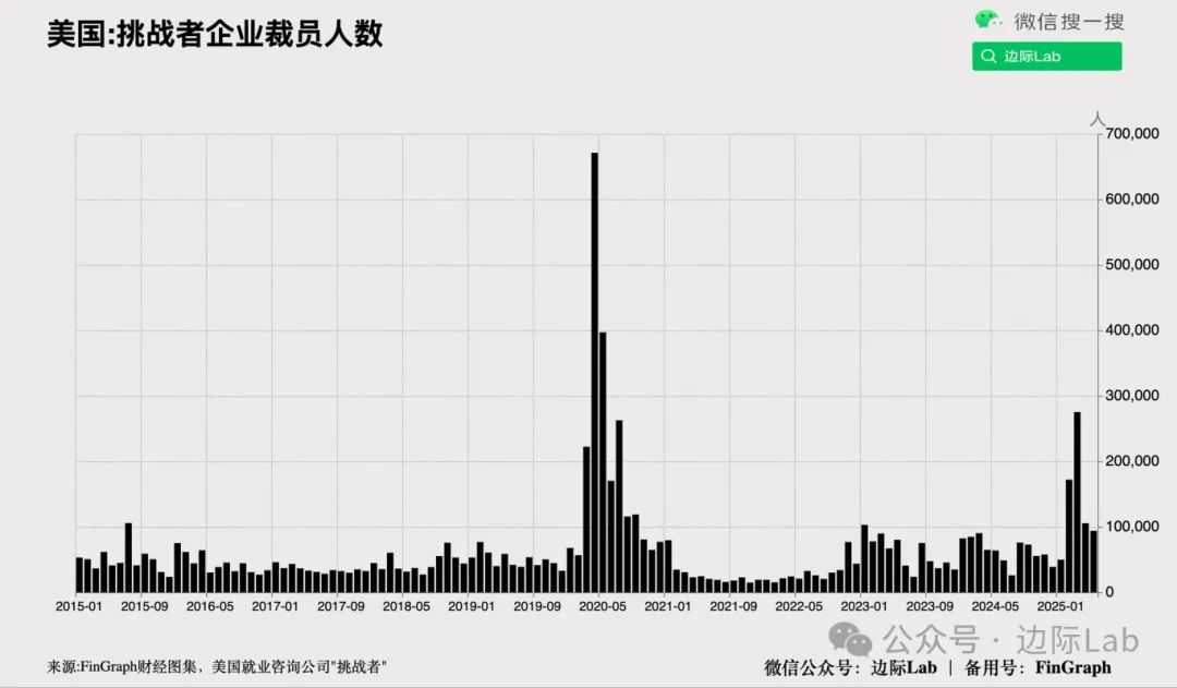 6.美国企业在2025年5月宣布裁员93,816人,创四个月来新低,较4月的105,441人有所下降。但服务业裁员达22,492人,为2020年5月以来最高,零售与医疗健康行业分别裁员11,483人和6,514人。Challenger公司指出,关税、财政削减、消费疲软和经济悲观预期加剧企业裁员压力。2025年截至5月,累计裁员达696,309人,同比激增80%。尽管如此,2025年裁员主因仍为“DOGE(政府效率署)影响”,涉及28.4万人次。