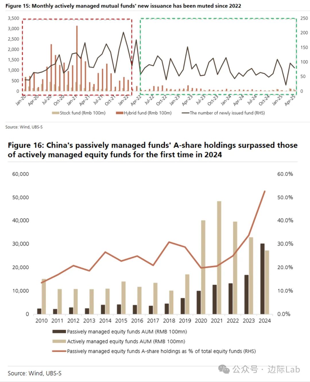 4.自2022年以来,中国主动管理型基金新发规模显著萎缩,2024年股票型与混合型主动基金合计发行仅910亿元,较2021年大幅下滑94%。与之形成鲜明对比的是,被动投资快速崛起。截至2024年底,ETF等被动权益基金的A股持仓首次超过主动基金,达到3万亿元,而2021年时仅为主动基金的四分之一。