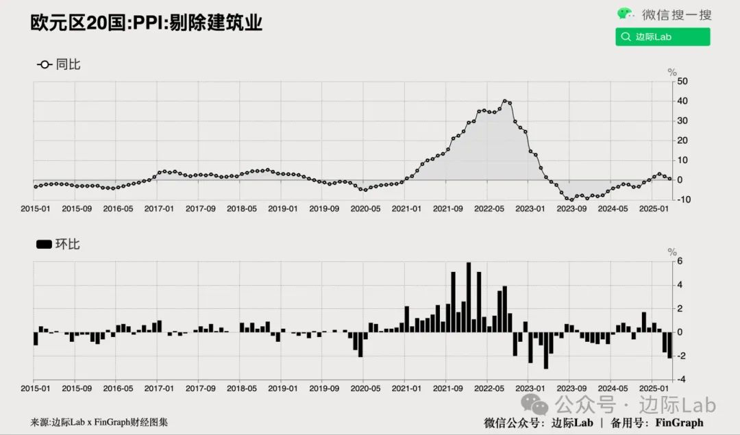 2.欧元区2025年4月工业生产者出厂价格(PPI)环比下降2.2%,为2023年4月以来最大跌幅,显著高于预期的-1.8%。能源价格大跌7.7%为主因,较上月的-5.8%进一步扩大,中间品价格亦微降0.1%。耐用与非耐用消费品价格小幅上涨,分别为0.1%与0.3%。主要经济体中,法国、意大利和西班牙环比跌幅分别为4.3%、3.0%和2.9%。同比来看,PPI涨幅从3月的1.9%骤降至0.7%。