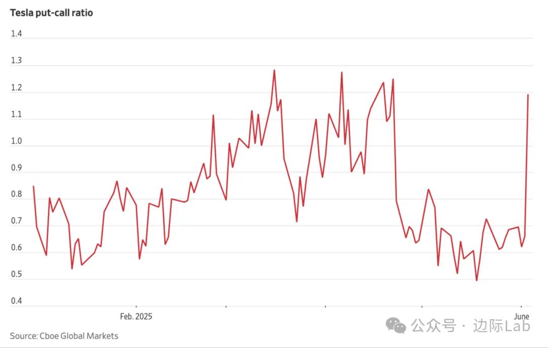 2.在特朗普与马斯克公开冲突后,特斯拉投资者加速涌入期权市场寻求避险。Cboe数据显示,特斯拉期权的看跌-看涨比率升至4月末以来最高,表明市场对股价进一步下行的担忧显著升温。