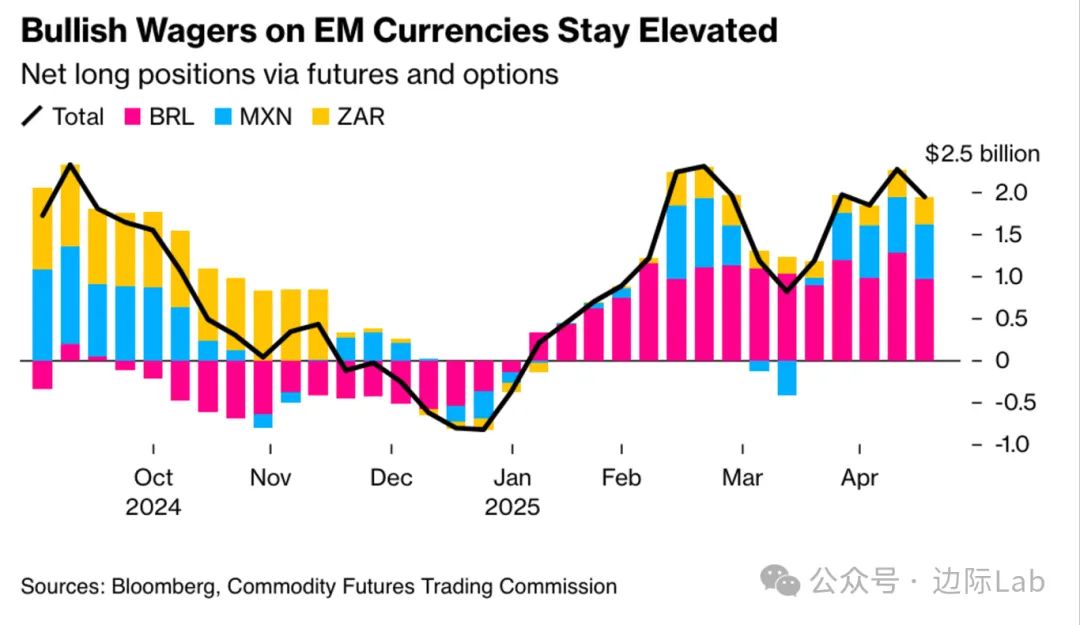 1.随着全球贸易紧张局势缓解以及汇率波动率下降,新兴市场货币的套利交易人气回升。投机者对新兴市场货币的看涨押注维持高位,主要货币的期货与期权净多头仓位逼近25亿美元。