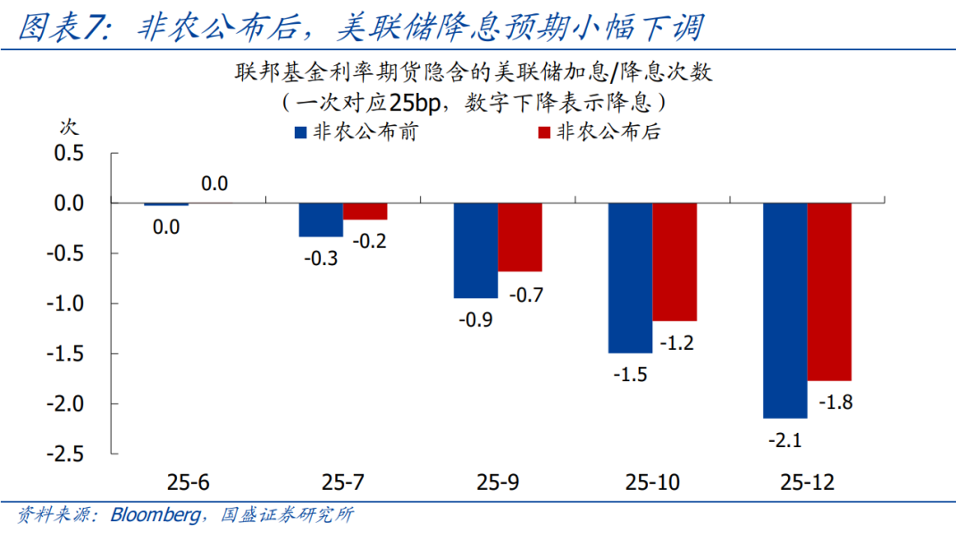 >降息预期变化:非农公布后,美联储降息预期小幅下调。利率期货隐含的2025年降息2 次的概率从100%降至80%左右,9 月降息概率也从接近100%降至70%左右。