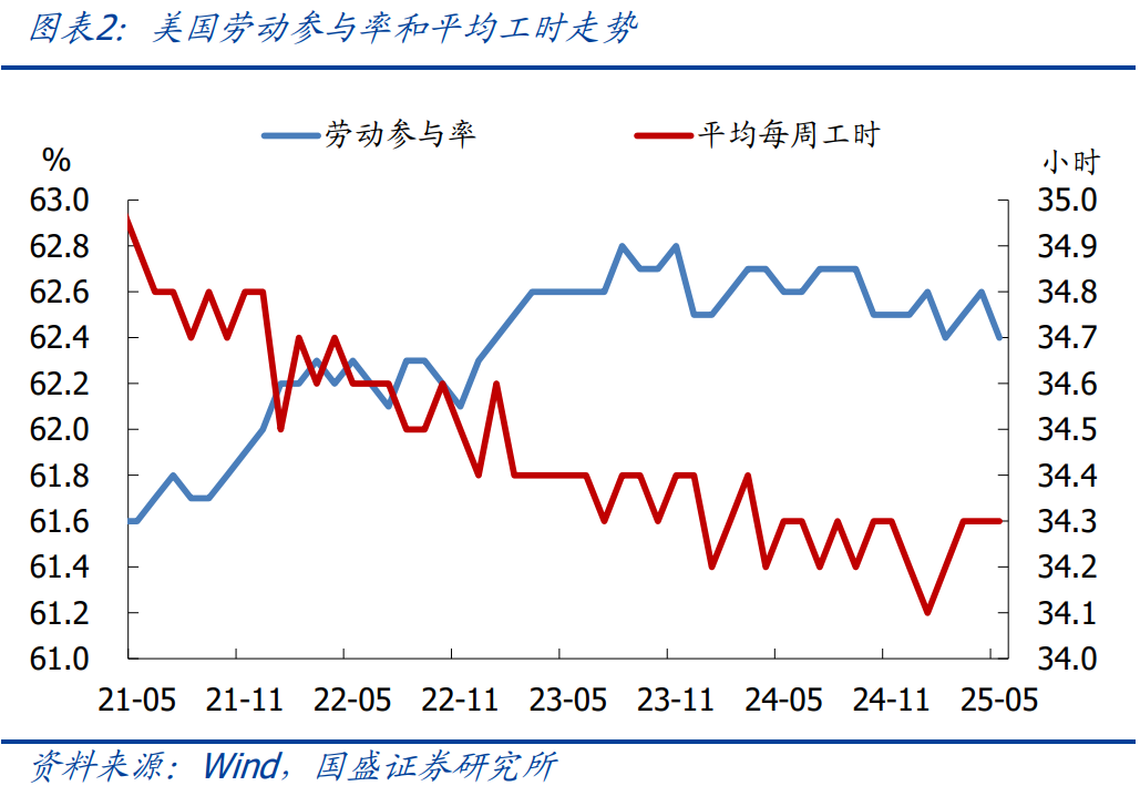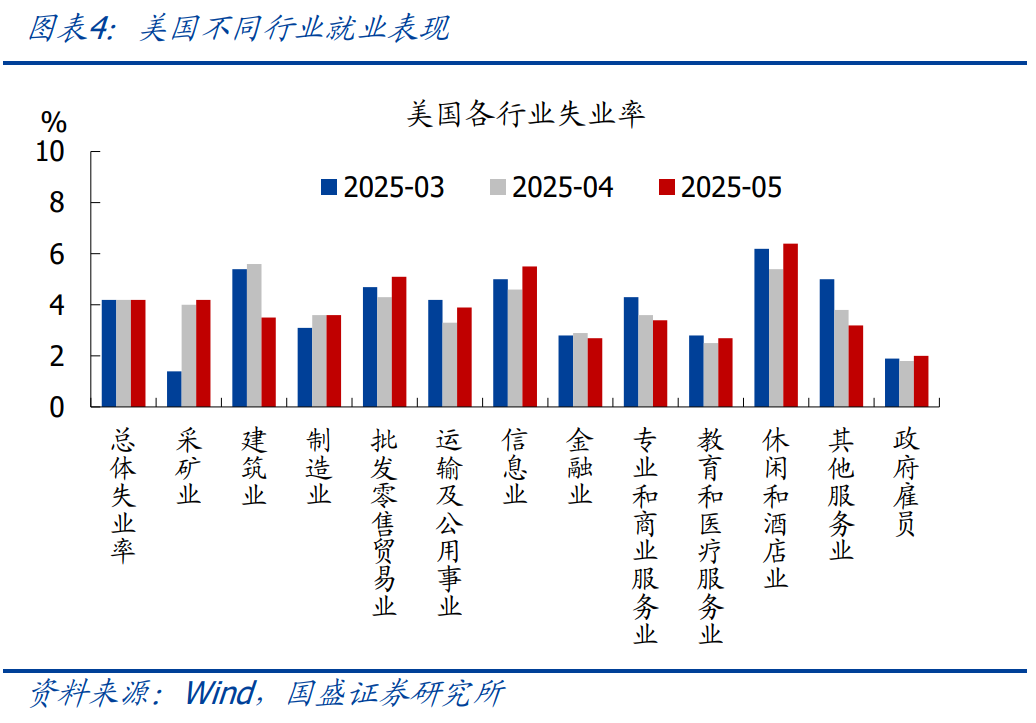 >行业就业表现:从美国各行业失业率表现来看,5月批发零售贸易业、运输及公用事业的失业率上升较多,可能反映了关税影响,休闲和酒店业、信息业就业状况同样有所恶化;制造业失业率不变;建筑业、其他服务业失业率下降较多,就业改善较为明显。