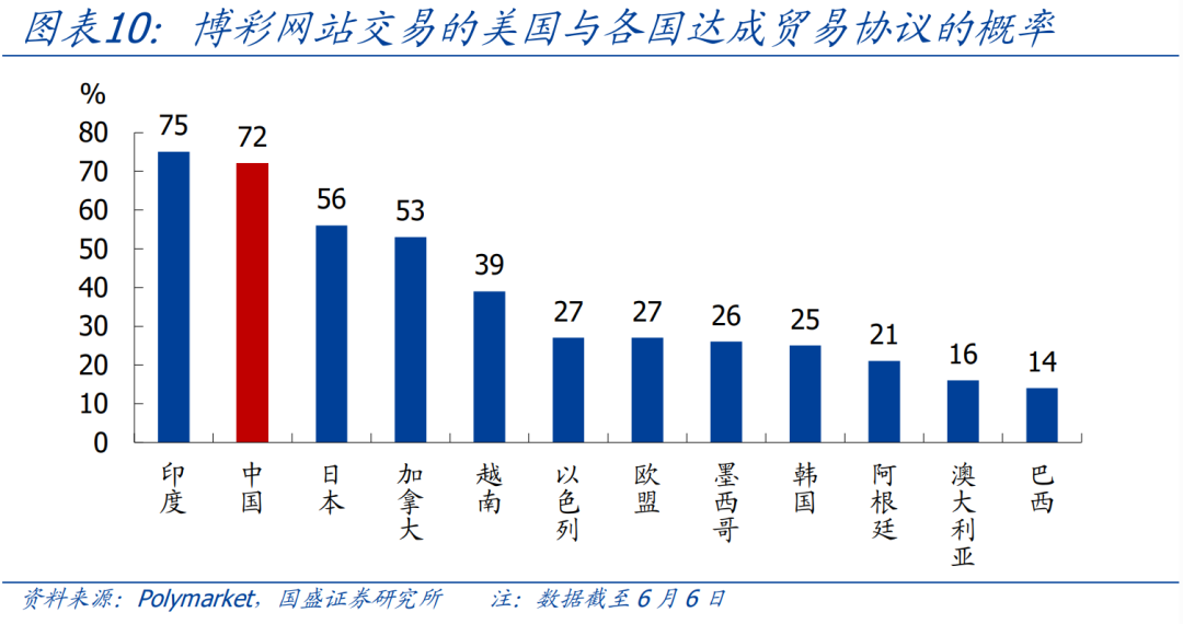 >未来两月重点关注:(1)贸易谈判进展:美国对其他国家的关税暂缓期截至7 月9 日,对中国的关税暂缓期截至8 月12 日。博彩网站Polymarket交易数据显示,截至6 月6日,市场预期美国与中国、印度、日本、加拿大达成贸易协议的概率高于50%,其他国家均低于50%。(2)特朗普“大美丽法案”(Big Beautiful Bill)能否通过国会:该法案主要内容包括减税、停止新能源补贴、提高债务上限等,现已在众议院通过,但参议院部分共和党人仍存在分歧。后续该法案能否在参议院通过,不但决定了减税等经济刺激措施能否落地,也决定了美国政府是否会在8 月因财政资金耗尽而陷入停摆。