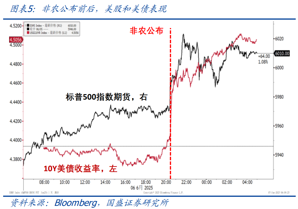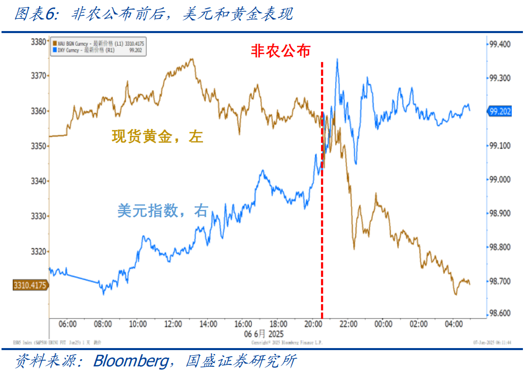 >大类资产表现:非农公布后,美股上涨,美债收益率和美元指数大幅上行,黄金下跌。截至6/7收盘,标普500、纳斯达克、道琼斯分别上涨1.0%、1.2%、1.1%;10Y美债收益率上行11.1 bp至4.51 %,美元指数上涨0.5%至99.2,现货黄金下跌1.3%至3309.5美元/盎司。