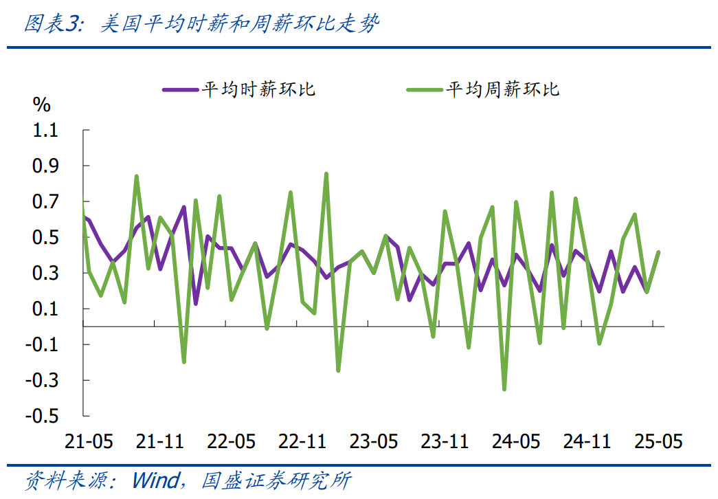 >整体就业表现:美国5 月新增非农就业13.9万,略高于预期值13.0万;4 月数据由17.7万下修至14.7万,3 月数据由18.5万下修至12.0万,两月合计下修9.5万。失业率4.2%,持平预期值和前值。劳动参与率62.4%,低于预期值和前值62.6%。每周平均工时34.3小时,持平预期值和前值。平均时薪环比0.4%,高于前值0.2%,同时高于预期值和过去12 个月均值0.3%。“萨姆规则”连续8 个月处在0.5%以下,未提示衰退风险,劳动力市场走弱担忧有所下降。