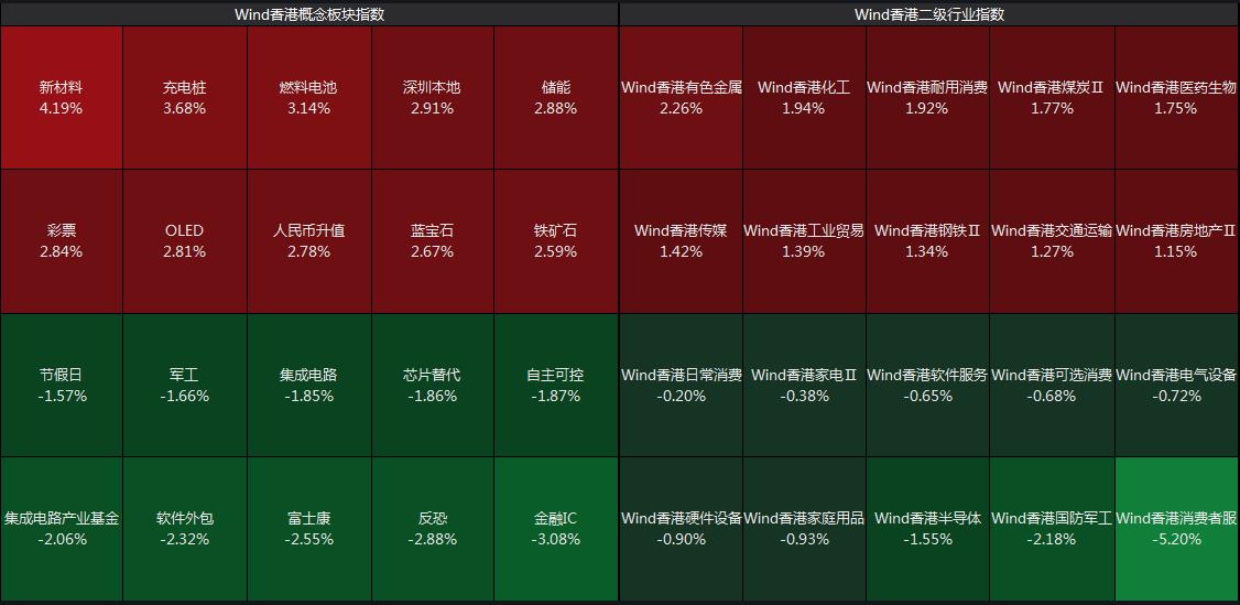 消费者服务板块跌超5%,英皇娱乐酒店跌超14%,汇彩控股跌超8%,澳门励骏跌超7%,古茗、蜜雪集团跌超6%,茶百道跌超5%。军工、半导体等板块跌幅靠前。