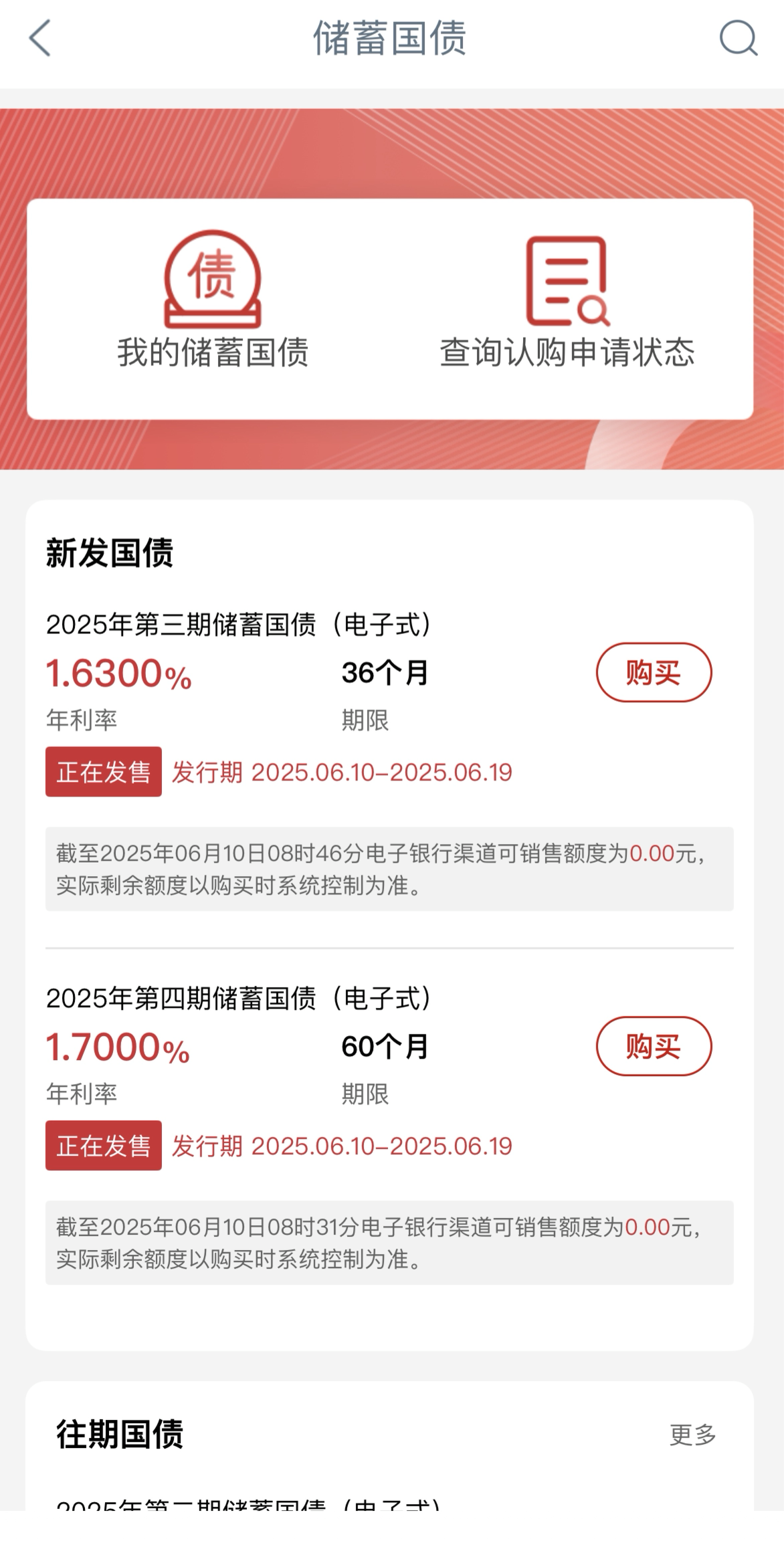 “2025年第三、第四期储蓄国债(电子式)将于6月10日火热发售,额度有限,先到先得。”在本次储蓄国债发行的前一日,多家银行客户经理已经开始提前预热。