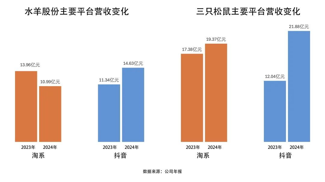 和御泥坊母公司水羊股份一样,另一家曾经的淘系明星品牌三只松鼠,过去一年也在抖音上拿到了优异成果。根据三只松鼠的数据财报显示,2024年其在抖音系的营收达到了21.88亿元,增幅高达81.73%,是天猫系的7倍多,营收规模也正式超过了天猫系。