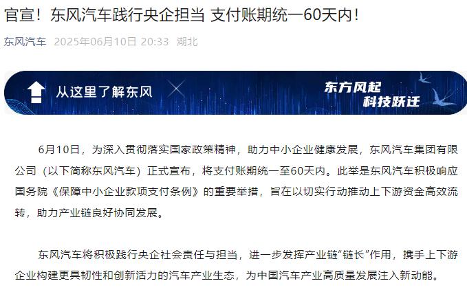 同日,东风汽车集团有限公司正式宣布,将支付账期统一至60天内。东风汽车表示,此举是东风汽车积极响应国务院《保障中小企业款项支付条例》的重要举措,旨在以切实行动推动上下游资金高效流转,助力产业链良好协同发展。
