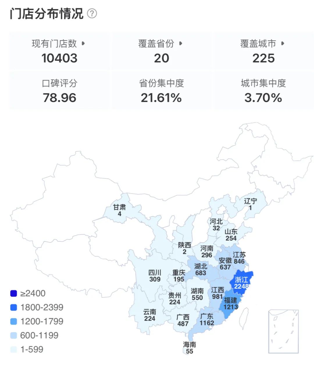 作为行业第二目前其门店仅覆盖了20个省份,且大多集中在中国地图的东南角落,而蜜雪冰城、茶百道、霸王茶姬等大多数头部品牌均已覆盖超30个以上。