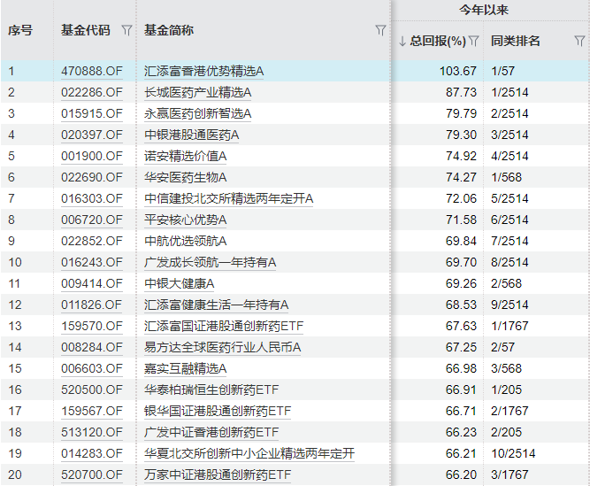紧随其后的分别是长城医药产业精选、永赢医药创新智选、中银港股通医药、诺安精选价值、华安医药生物,年内收益率分别为87.73%、79.79%、79.30%、74.92%、74.27%。