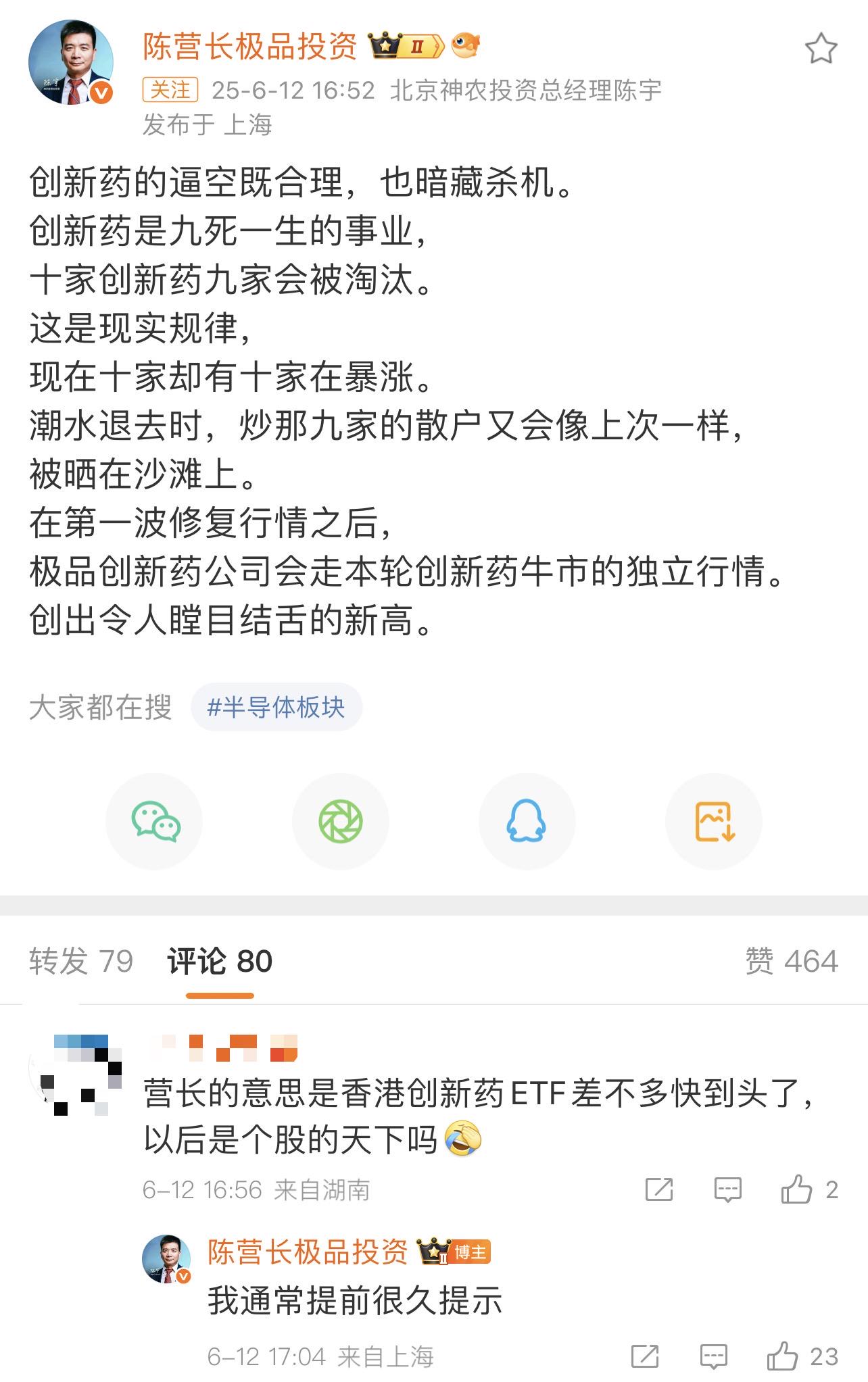 6月12日,知名私募大V、神农投资创始人陈宇也在微博上提示风险。他表示:“创新药是九死一生的事业……现在十家却有十家在暴涨,潮水退去后,炒那九家的散户又会像上次一样,被晒在沙滩上。”