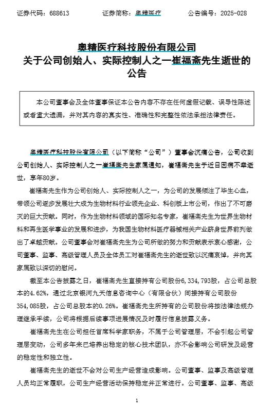 奥精医疗表示,公司董事会对崔福斋为公司所做的努力和贡献表示衷心感谢,公司董事、监事、高级管理人员及全体员工对崔福斋的逝世致以沉痛哀悼,并向其家属致以深切的慰问。