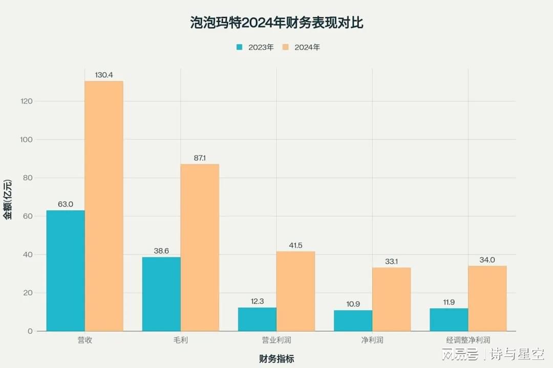 泡泡玛特2024年实现营收130.38亿元,较2023年的63.01亿元同比增长106.9%,首次突破百亿大关。公司毛利达到87.08亿元,同比增长125.4%,毛利率从2023年的61.3%提升至66.8%,创历史新高。营业利润表现尤为突出,达到41.54亿元,同比增长237.6%。