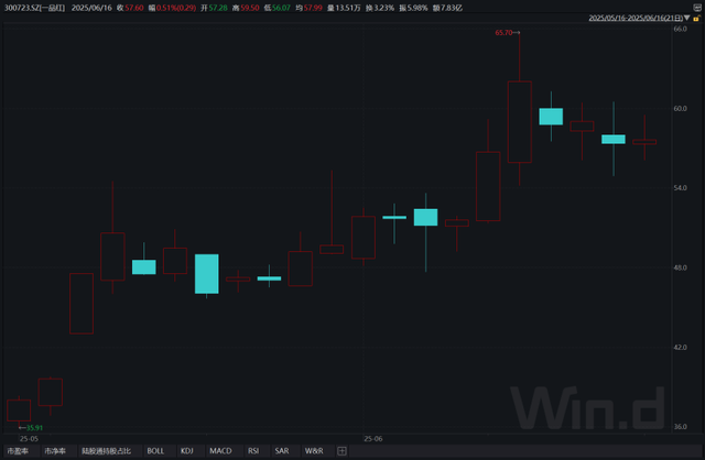 2025年5月17日至6月16日短短一个月内,股价涨幅高达51.54%,从36.82元飙升至57.6元,日均成交额达8.00亿元;其中股价最高于6月10日盘中触及65.7元,市场表现较为活跃。