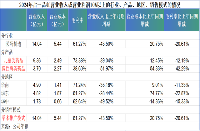 其中,儿童药业务作为公司医药制造的支柱之一,2024年收入达9.36亿元,占医药制造业务收入的64.57%。然而,与2023年相比,该业务收入下降了39.04%。