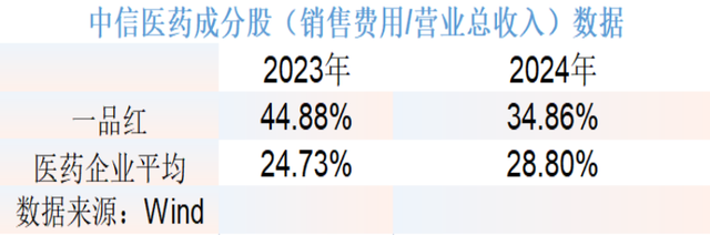 Wind数据统计显示,2023年及2024年,一品红的销售费用率为44.88%、34.86%;同期中信医药成分股,可用于统计的共471家上市公司平均值为24.73%、28.8%。