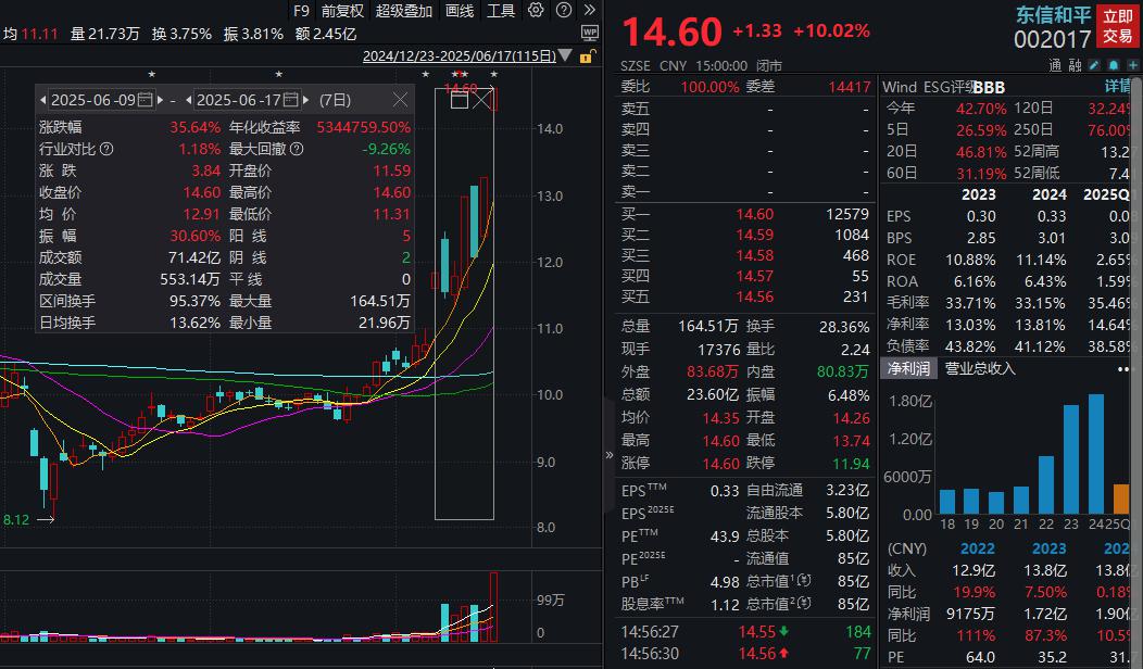 Wind显示,6月9日至17日,东信和平在7个交易日内斩获4个涨停板,股价累计涨幅达35.64%。