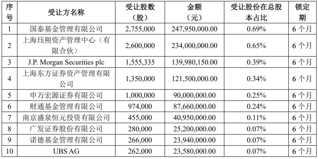 此次交易中的前四大受让方分别为国泰基金管理有限公司、 上海珏朔资产管理中心(有限合伙)、J.P. Morgan Securities plc和上海东方证券资产管理有限公司,均获得超135万股;此外,瑞银集团、摩根士丹利也在受让方之列。