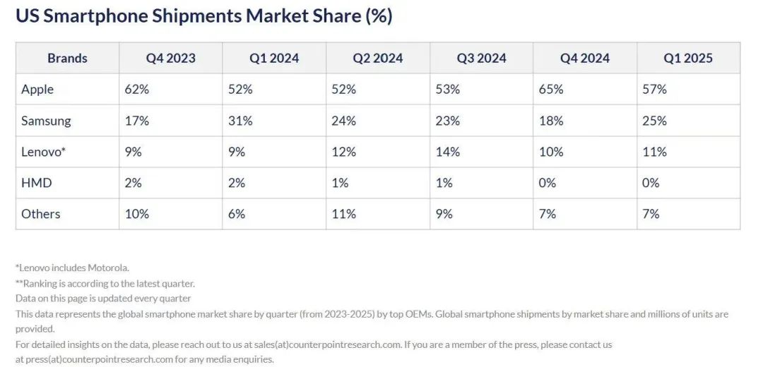 美国智能手机出货量市场份额百分比 数据来源:Counterpoint Research