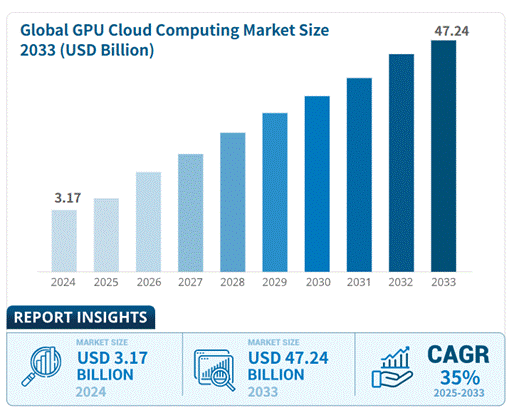 与提供广泛通用服务的传统通算云服务商不同,NeoCloud 专注为 AI 工作负载提供高性能基础架构。据Business Research预测,全球GPU专用云市场规模将由2024年的31.7亿美元快速增长至2033年472.4亿美元,增长近15倍,复合增长率约为35%。